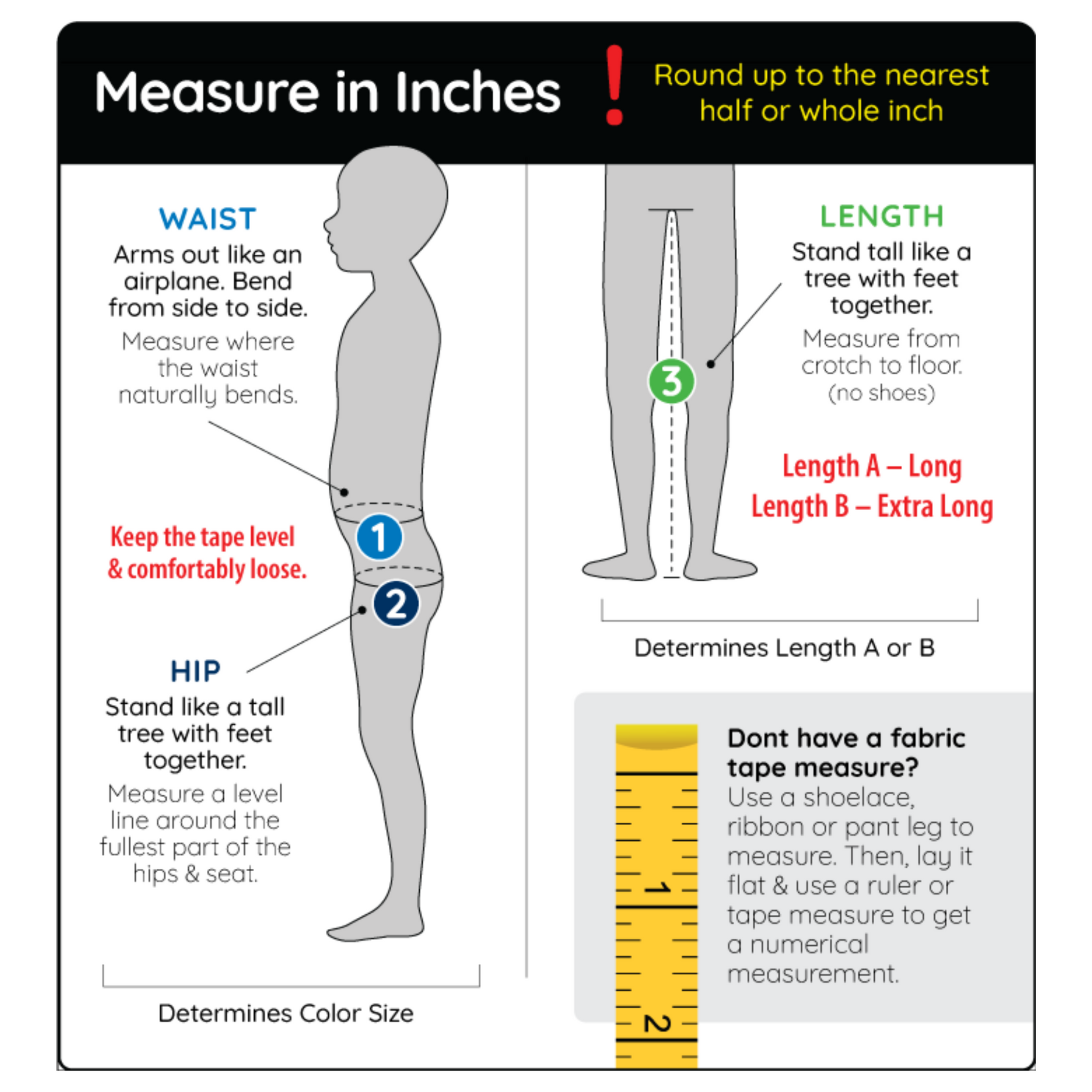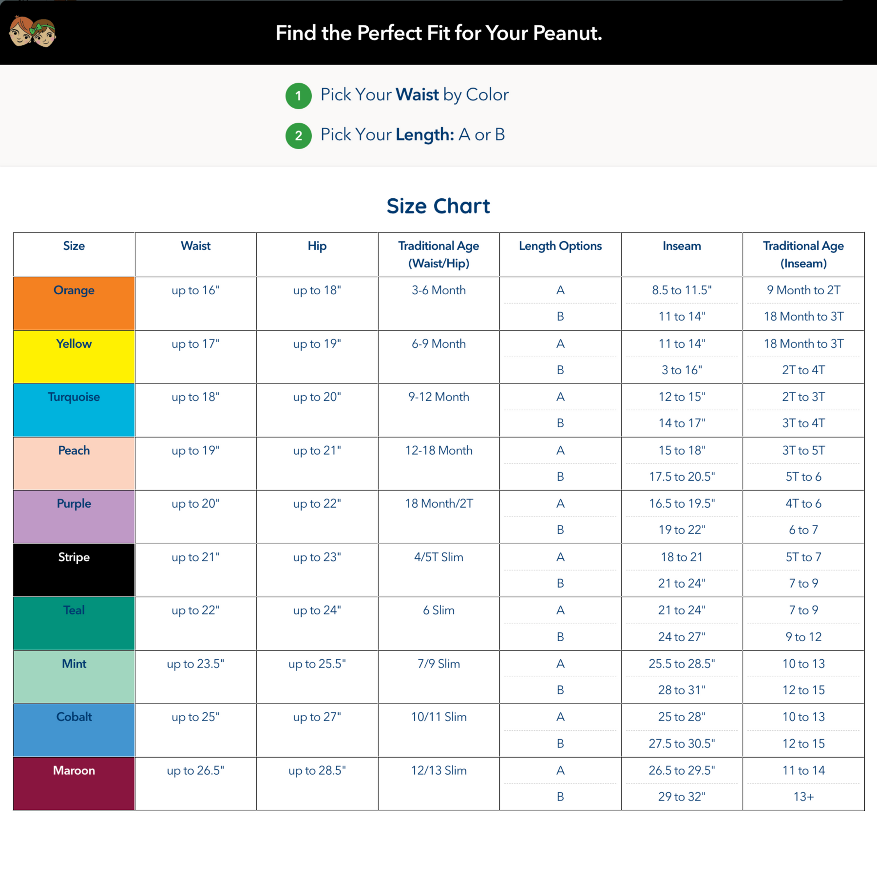 | Size | Waist | Hip | Traditional Age (Waist/Hip) | Length Options | Inseam | Traditional Age (Inseam) |