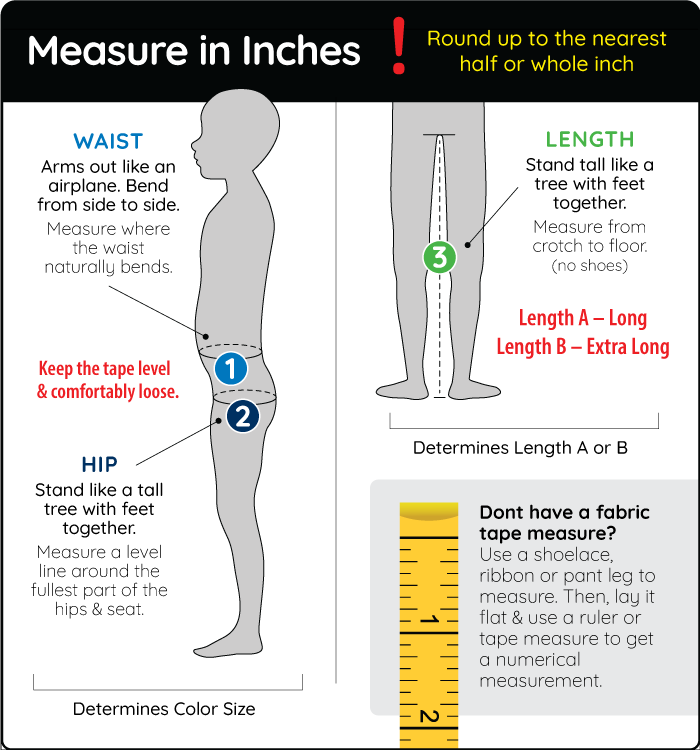 2) Our pants are not like most brands. For example, we pair a size 3T with a 5T length. This would require custom tags for every size of pant; sizing by color is a more cost-effective solution. Plus, measuring helps ensure a more accurate fit.